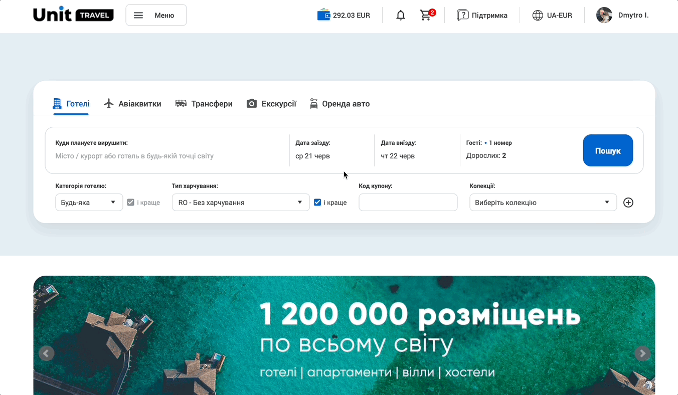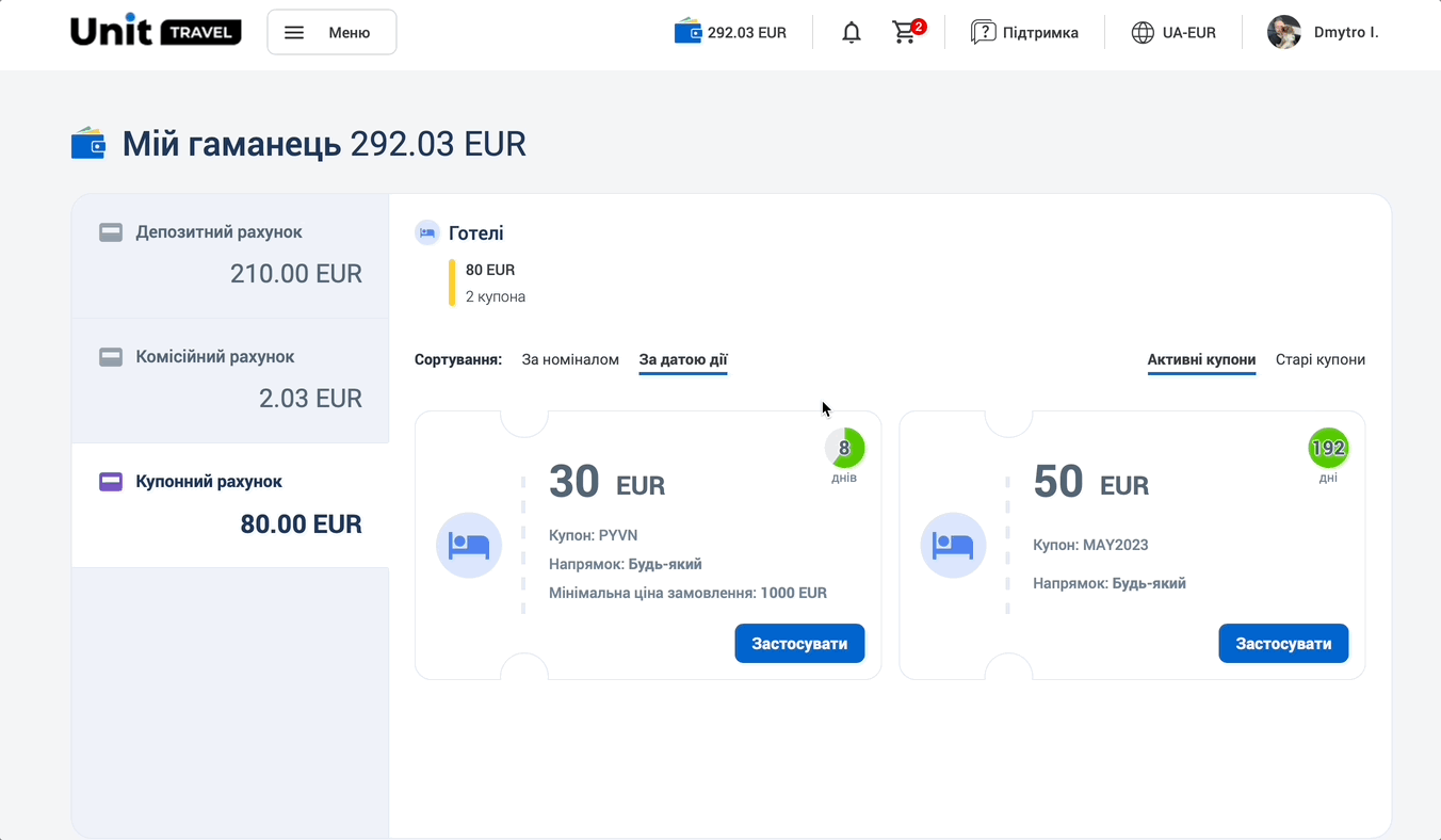 Купони  – це розділ, у якому відображаються спеціальні знижки від Unit Travel на окремі продукти. Усі купони є унікальними та мають строк дії.